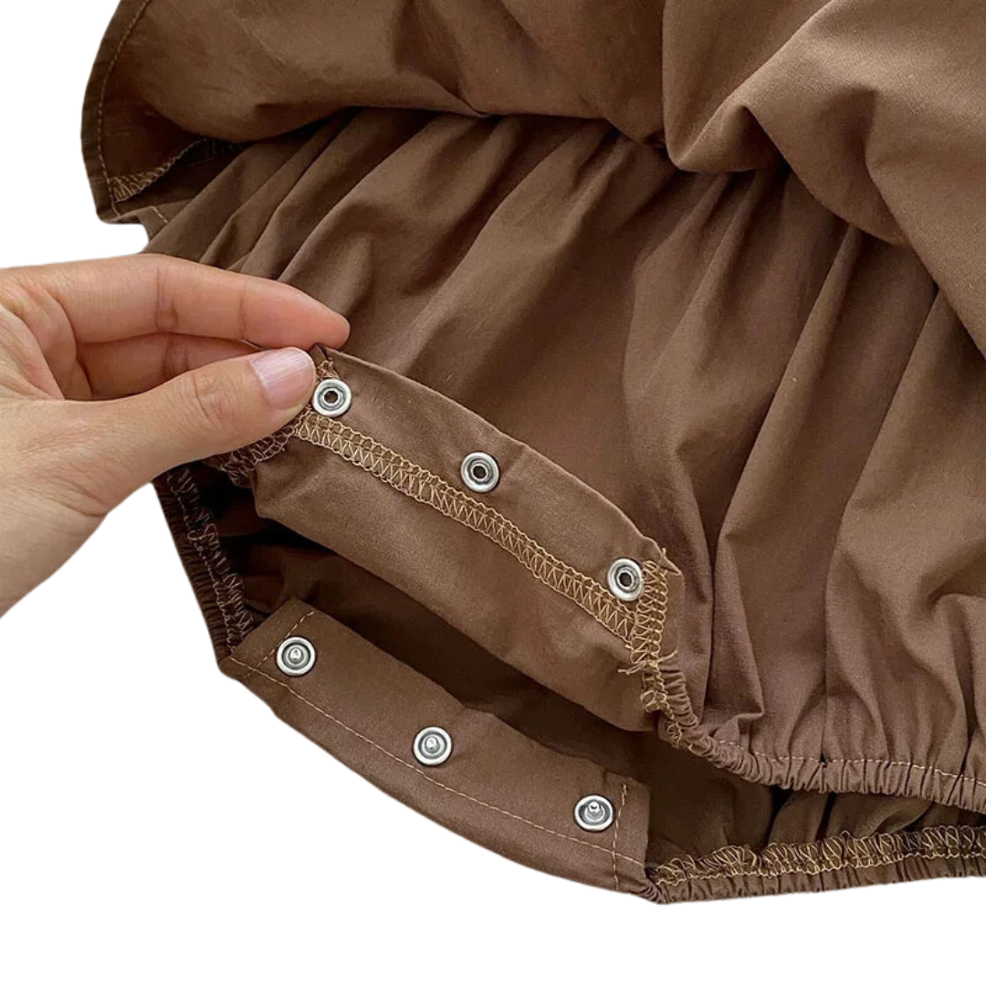 Dieses bezaubernde Baby-Outfit besteht aus einem braunen Kleid mit beiger Bluse und niedlichem Kragen. Perfekt für besondere Anlässe oder den Alltag, bietet dieses modische Baby-Kleidungsstück nicht nur Stil, sondern auch Komfort. Die langärmelige Bluse hält Ihr Baby warm, während der weiche Stoff sanft zur empfindlichen Babyhaut ist. Die Druckknöpfe erleichtern das An- und Ausziehen. Ideal für Eltern, die nach hochwertiger und stilvoller Babybekleidung suchen.
